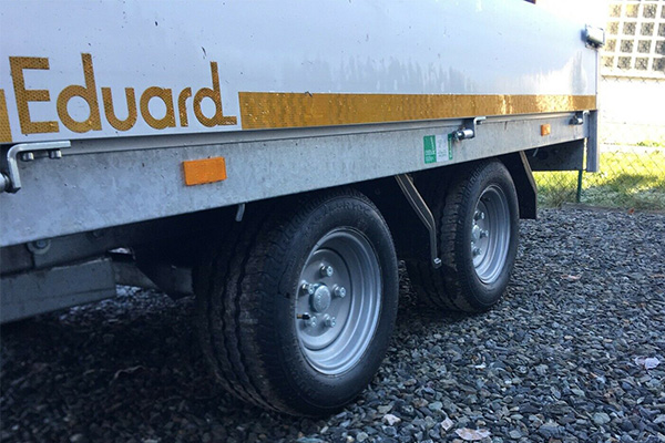 Der Hänger hat eine Tandem-Achse, Stützrad und eine 100 km/h Zulassung.