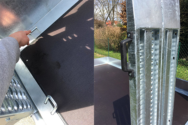 Geschweißte Bordwand-/Rahmenkonstruktion aus Stahlblech und geschraubte V-Zugdeichsel, feuerverzinkt; 2 feuerverzinkte Stahlauffahrrampen (LxB): 153 x 36 cm mit rutschhemmendem Gitterbelag, sowie integrierten Stützfüßen, Traglast je Rampe beträgt 1.500 kg.